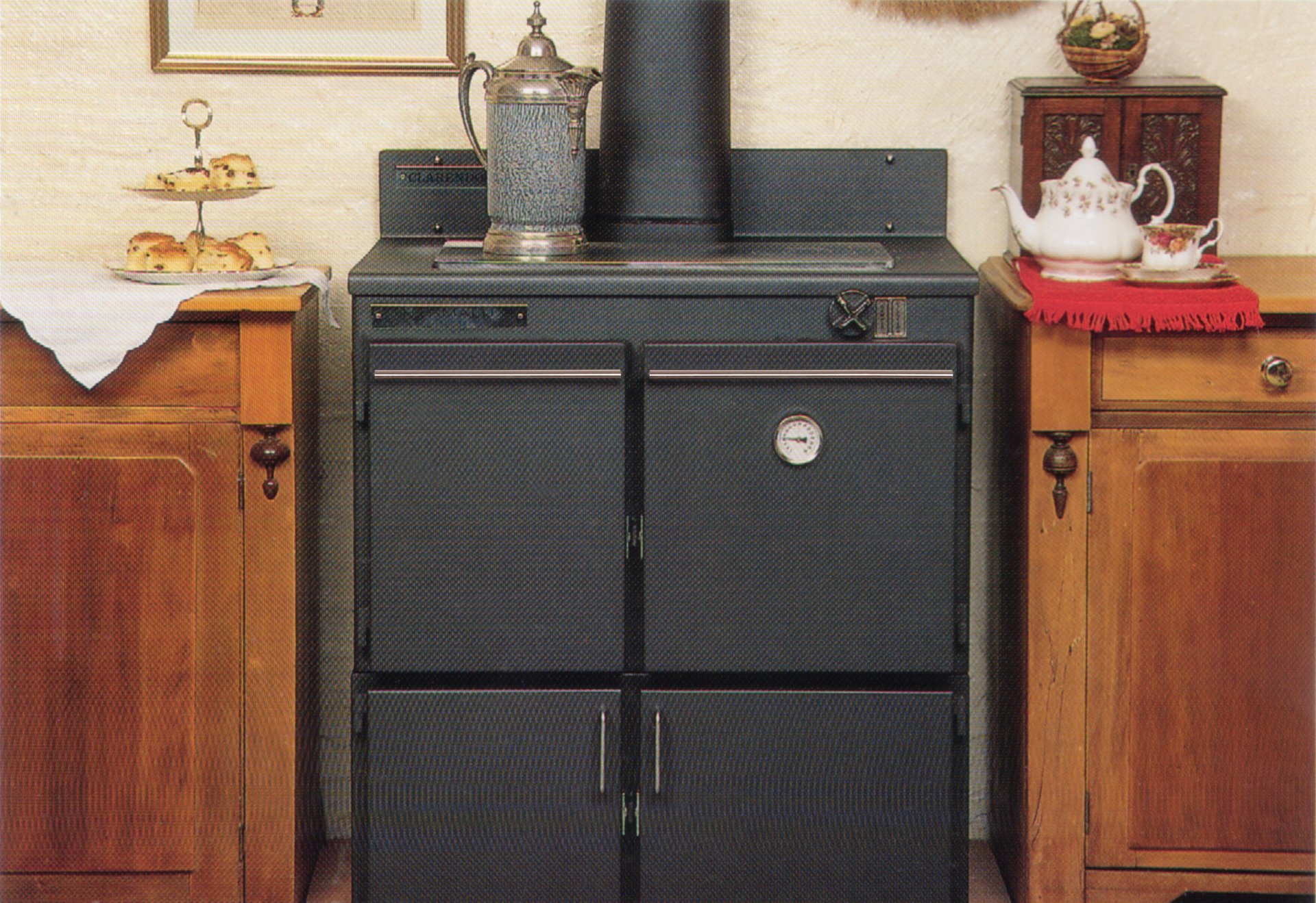 The doors on the cooker and base cabinet are also available in optional powdercoat colours. The Clarendon is available in the standard Thermalux colour range.